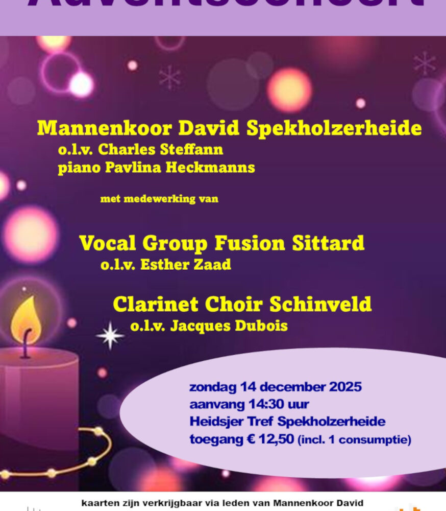Op zondag 14 december a.s. organiseert Mannenkoor David Spekholzerheide een adventsconcert. Deze keer niet in de kerk maar in de zaal van gemeenschapshuis Heidsjer Tref. Het concert begint om 14:30 uur en de toegangsprijs bedraagt € 12,50 (inclusief een consumptie). Aan dit concert wordt medewerking verleend door Vocal Group Fusion uit Sittard onder leiding van Esther Zaad en door Clarinet Choir Schinveld onder leiding van Jacques Dubois.