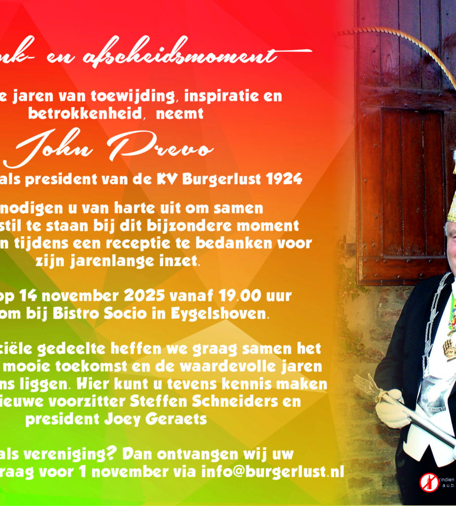 Op 14 november vindt de afscheidsreceptie plaats voor John Prevo. Hij neemt na jarenlange inzet afscheid als president van KV de Burgerlust.