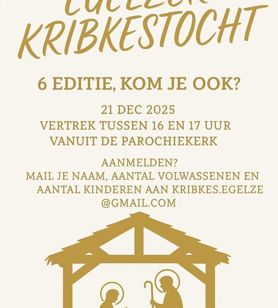 Op 21 december wordt voor de zesde keer wordt de Egelzer Kribkestocht georganiseerd. Tussen 16.00 en 17.00 uur wordt er vertrokken vanuit de parochiekerk. Aanmelden kan via kribkes.egelze@gmail.com door het aantal volwassenen en kinderen aan te geven.
