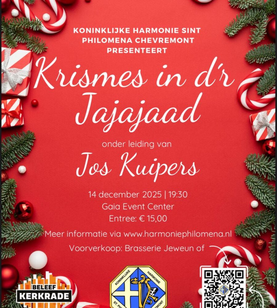 Kom in kerststemming met ‘Krismes in d’r Jajajaad’. De Koninklijke Harmonie Sint Philomena Chevremont presenteert een sfeervol kerstconcert onder leiding van Jos Kuipers.